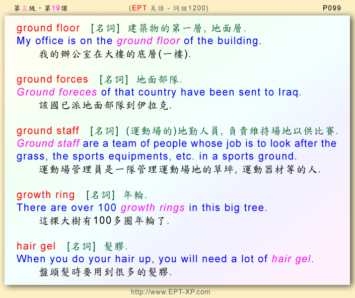 第五部 第19課: ---請大聲重複跟讀 3-5 回合, 不多久, 您必可說出流暢的美語--- ground floor ; ground forces ; ground staff ; growth ring ; hair gel