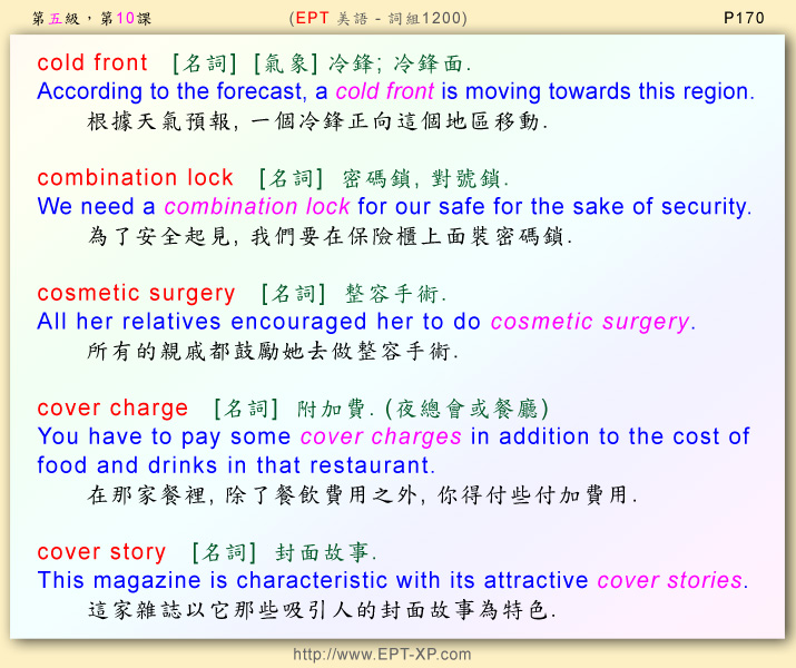 第九部 第十課: ---請大聲重複跟讀 3-5 回合, 不多久, 您必可說出流暢的美語--- cold front ; combination lock ; cosmetic surgery ; cover charge ; cover story