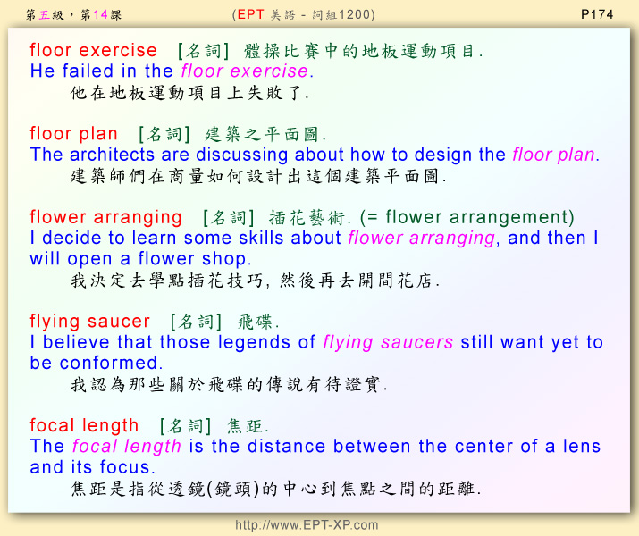 第九部 第14課: ---請大聲重複跟讀 3-5 回合, 不多久, 您必可說出流暢的美語--- floor exercise ; floor plan ; flower arranging ; flying saucer ; focal length
