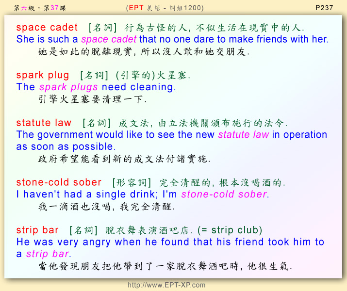 第12部 第17课: ---请大声重复跟读 3-5 回合, 不多久, 您必可说出流畅的美语--- space cadet ; spark plug ; statute law ; stone-cold sober ; strip bar