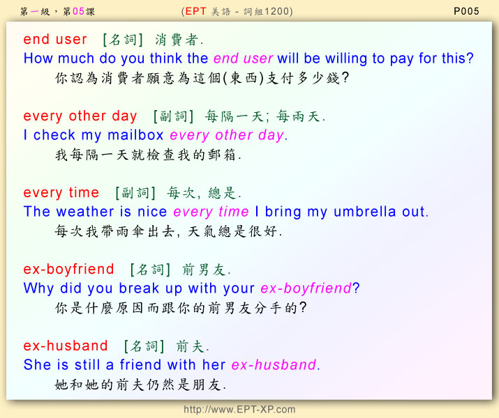 第一部 第五課: ---請大聲重複跟讀 3-5 回合, 不多久, 您必可說出流暢的美語--- end user ; every other day ; every time ; ex-boyfriend ; ex-husband
