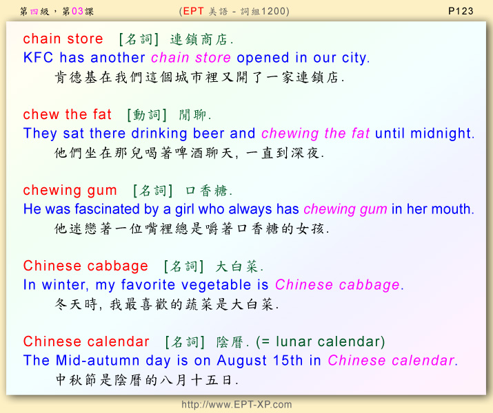 第七部 第三課: ---請大聲重複跟讀 3-5 回合, 不多久, 您必可說出流暢的美語--- chain store ; chew the fat ; chewing gum ; Chinese cabbage ; Chinese calendar