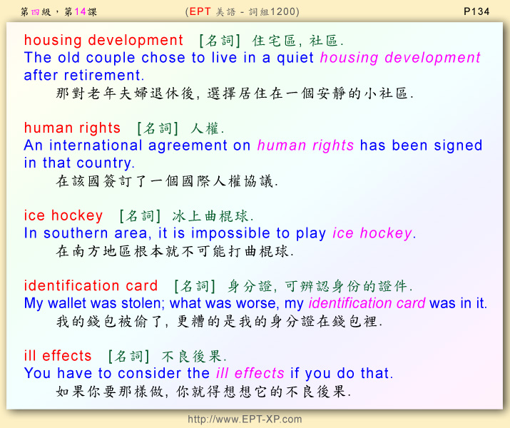 第七部 第14課: ---請大聲重複跟讀 3-5 回合, 不多久, 您必可說出流暢的美語--- housing development ; human rights ; ice hockey ; identification card ; ill effects