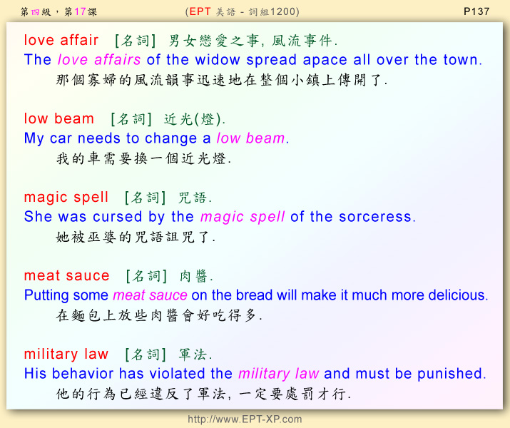 第七部 第17課: ---請大聲重複跟讀 3-5 回合, 不多久, 您必可說出流暢的美語--- love affair ; low beam ; magic spell ; meat sauce ; military law