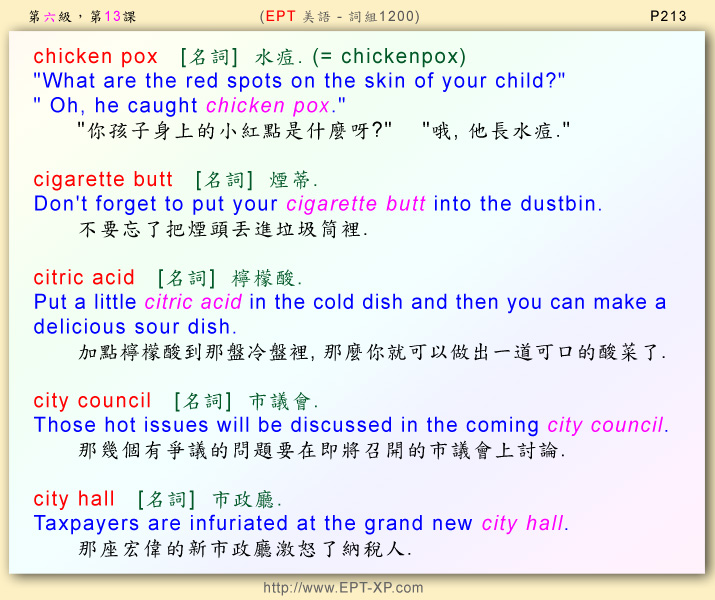第11部 第13課: ---請大聲重複跟讀 3-5 回合, 不多久, 您必可說出流暢的美語--- chicken pox ; cigarette butt ; citric acid ; city council ; city hall