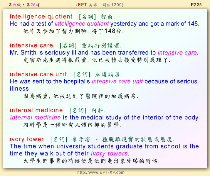 第12部 第五課: ---請大聲重複跟讀 3-5 回合, 不多久, 您必可說出流暢的美語--- intelligence quotient ; intensive care ; intensive care unit ; internal medicine ; ivory tower